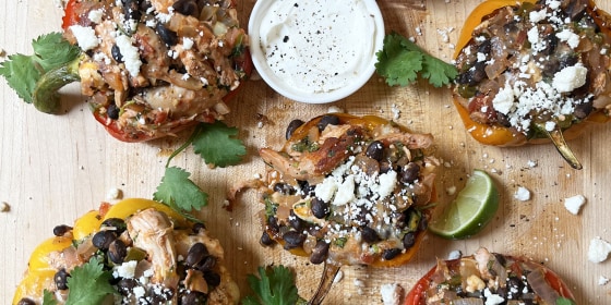 The finished peppers can be served with all of your favorite fajita toppings. I like to garnish themwith more queso fresco, chopped cilantro, a squeeze of fresh lime and a generous spoonful of sour cream. You could also add a few dashes of your favorite Mexican hot sauce, a spoonful of pickled jalapeños, some finely chopped onion or more salsa. A side of chips and your favorite guacamole, a cold beer or Mexican soda would be delicious alongside this family-friendly entrée.
