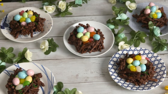 What makes these bird nests stand out is the use of both chocolate and peanut butter. Not only is it a classic flavor combination that can’t be beat, but the combination is the secret to getting the pretzel sticks to form the shape of mini birds nests. To make them, melt chocolate chips and peanut butter together in the microwave, then combine the mixture with broken pretzel sticks. Next,drop the coated pretzels onto a lined baking sheet and use your fingers to shape the mounds into the shape of small birds nest. From here, all you have to do is transfer the baking sheet to the refrigerator for 15 minutes to allow for the chocolate to harden. Once firm, fill the nests with jelly beans and candy-coated chocolate eggs to complete the seasonal spring treat.