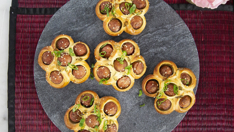 1.On the work surface, roll out a portion of dough into a 3- by 7-inch rectangle (it should be large enough to wrap around a hot dog). Place a hot dog in the center of the dough and pinch the edges of the dough together to seal completely around it. Slice into 6 equal pieces. Arrange the pieces on the baking sheet, cut-sides up, in a flower formation — one in the center with five pieces surrounding it. Repeat with remaining dough and hot dogs. Space each bun at least 3 inches apart. Cover with a damp, clean kitchen towel and let them rest in a warm spot until doubled in size, 45 minutes to 1 hour.
