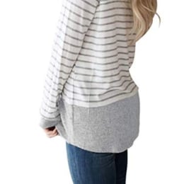 Our size Large model, Kourtney Edwards, chose to match her gray shirt with a pair of dark wash jeans, large silver hoops and brown ankle booties. She loved the shirt for its versatility and comfort.