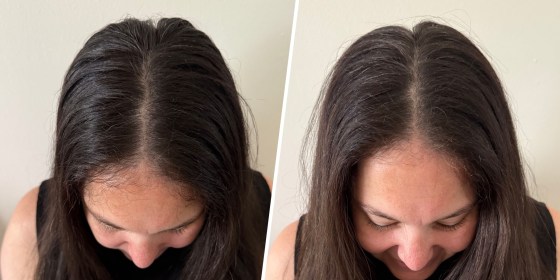 I start by parting my hair down the middle. I hold the bottle about six inches away from my scalp and spray a few times along my partline and around my temples. Then, I flip my hair over and spritz a couple of times along the back of my scalp. To finish, I flip my hair back over and massage the product in for a few seconds. And voilà!