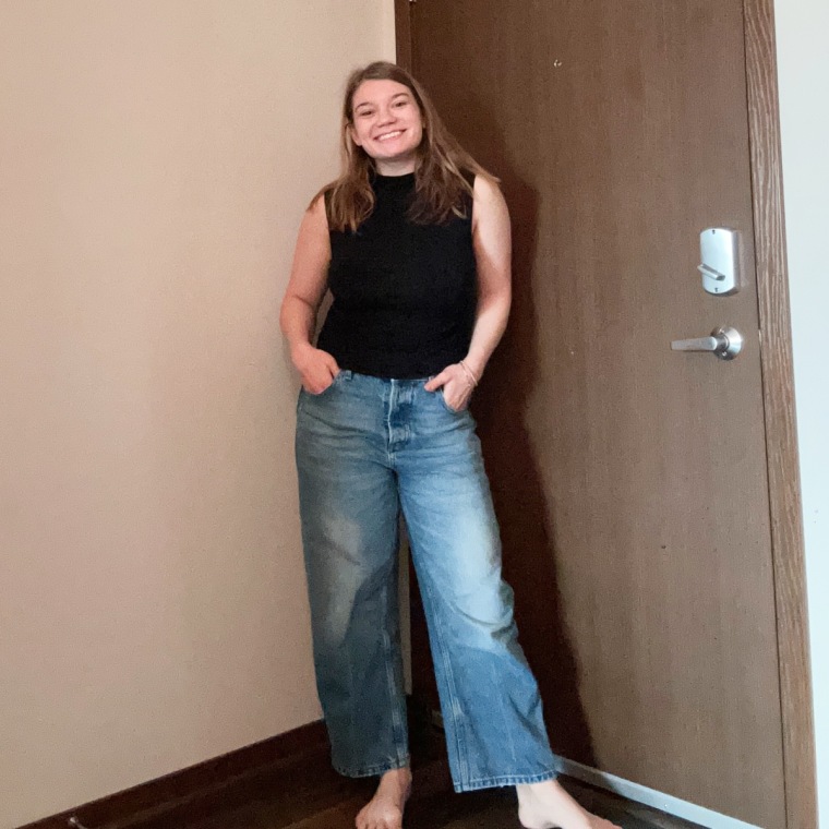 "I tried on my usual size and it had a flattering high-waisted fit, but I’ve been liking my jeans baggier lately, so I sized up for a lower rise and looser fit," Ekman suggested.