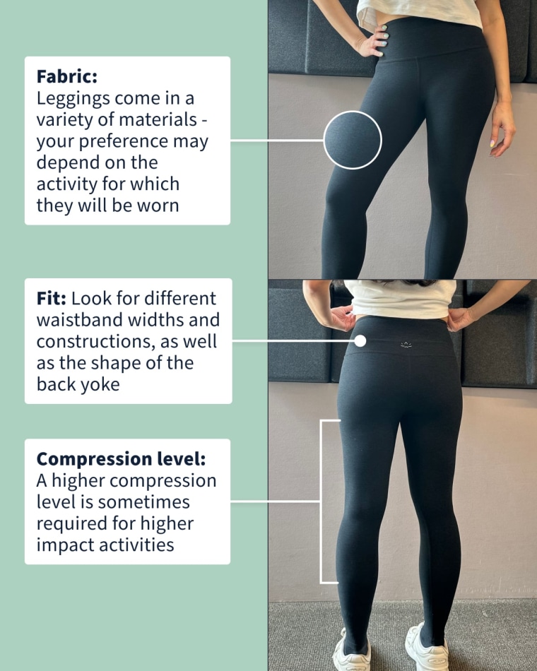 Leggings come in different lengths, shapes and materials. Angelica Melendez, the chief product officer at Felina, says there are three main features to look for in leggings: fabric, fit and compression level.