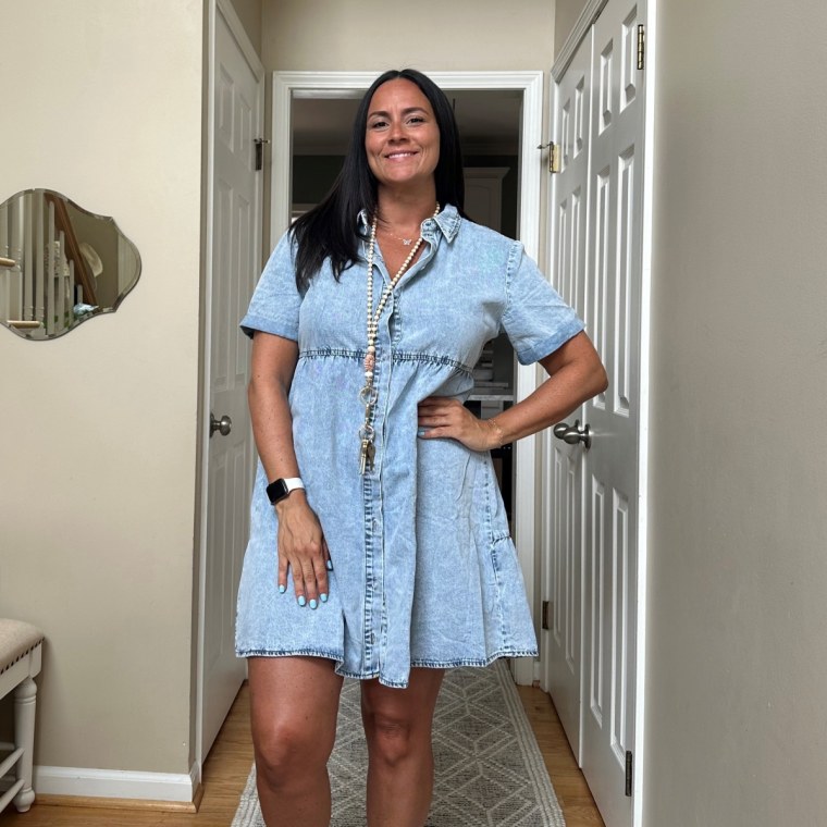 Dimassimo-Owens can’t get enough of this babydoll denim dress that features a cute lapel collar and buttons down the front. "I like something that transitions well and can be dressed up with some wedges or heels and dressed down with some dunks or cute sandals just in case I have dinner after school or practice with the kiddos!" she says.