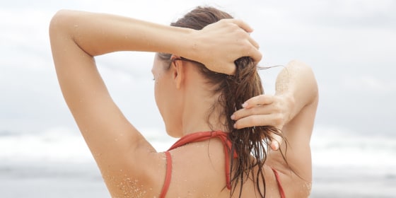 "Some of the signs of sun or salt damage are brittleness, dry split ends and frizz," Craigie tells Shop TODAY, adding that those who highlight their hair are even more likely to see signs of sun and salt damage since lightening can dry out your locks. "Wetting hair with fresh tap water before swimming can keep it from absorbing drying chemicals and salt. Spraying hair with a leave-in conditioner or hair sunscreen will [also] protect those locks."