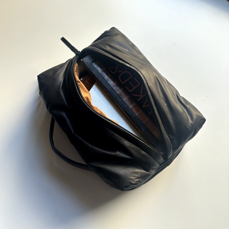 Nolan prefers something a bit more durable. “Makeup bags made of leather are the best, in my opinion, as it’s the most durable and the best for longevity,” she says. “An added bonus: if a product spills within a leather bag, it’s easier to clean than bags made of silk, cotton, velvet etc.”