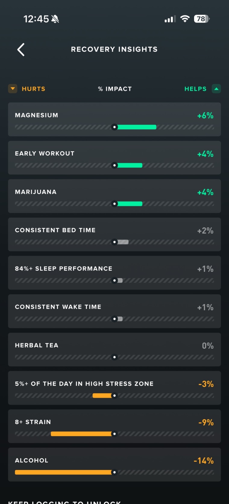 There is also a journal feature that lets you keep track of habits. After keeping up with it and logging enough nights of sleep, the app will give you an overview of how these behaviors affect your rest. For example, I’ve found that taking magnesium before bed improves my recovery score by six percent on average, while logging a workout earlier in the day boosts it by four percent. On the other hand, I’ve discovered (unsurprisingly) that drinking alcohol has the biggest negative impact on my recovery and typically lowers my recovery by 14 percent.