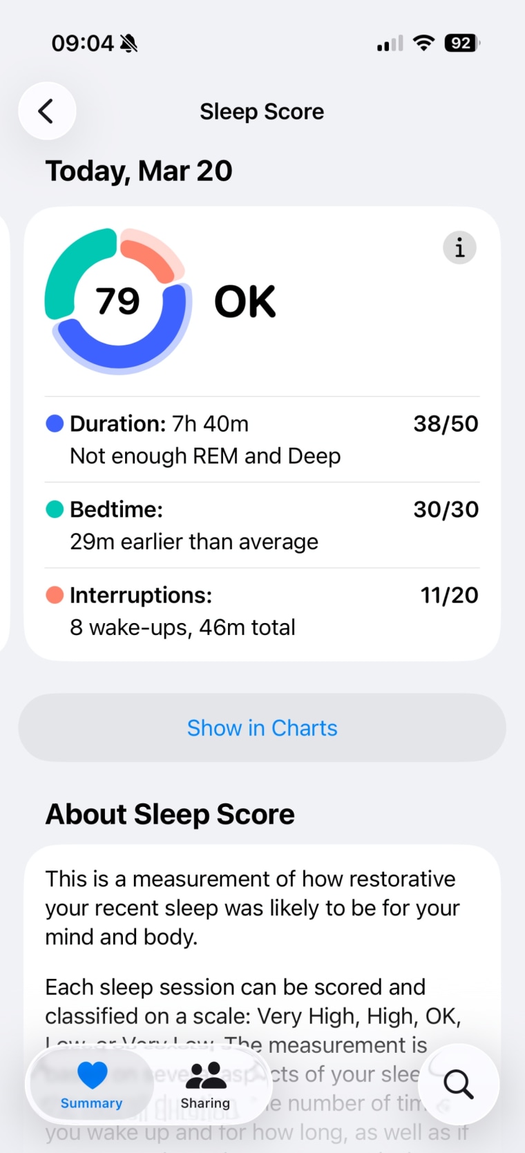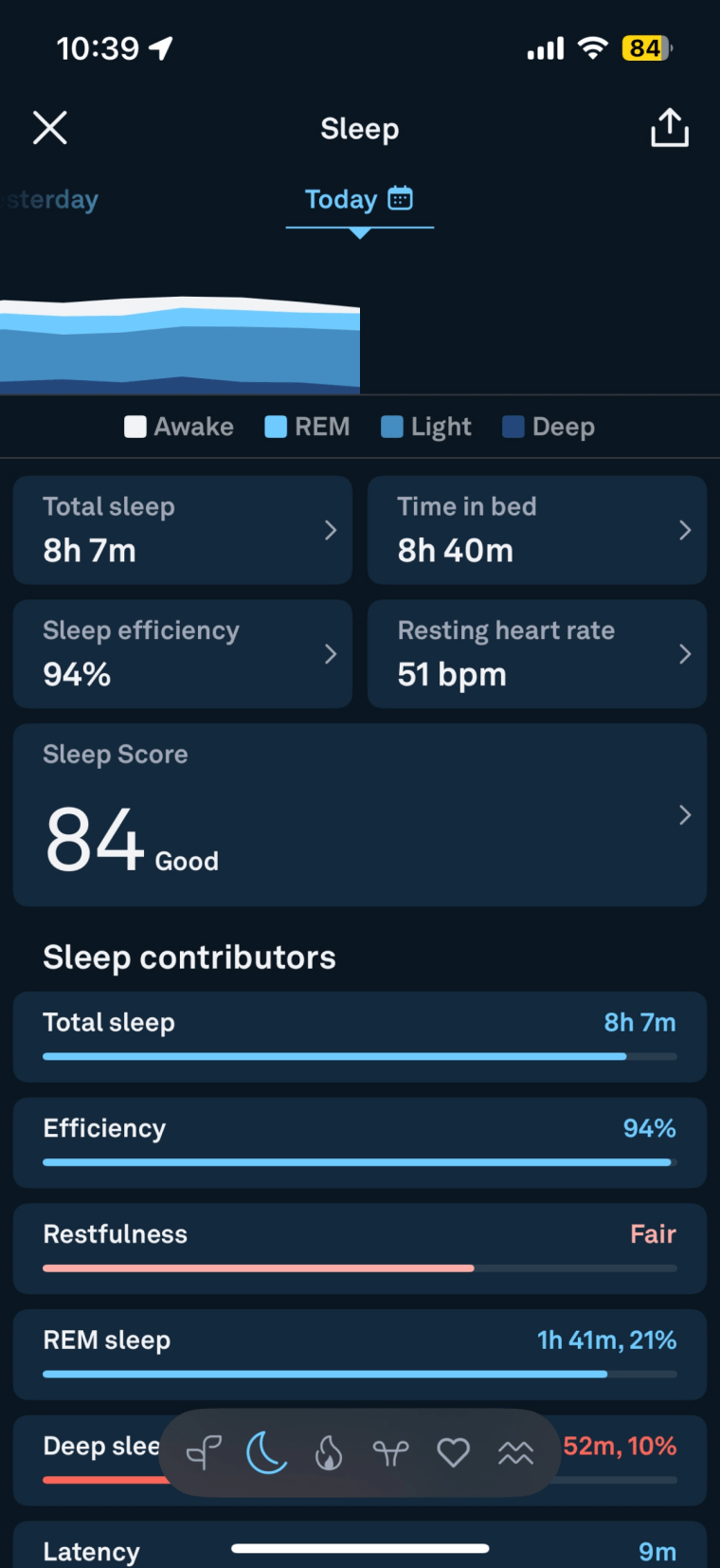 The sleep score is based on how long you slept, time spent in each sleep stage and how long it took you to fall asleep. Your readiness score, on the other hand, takes into account that sleep data, as well as your activity, heart rate, body temperature and more, to help you plan your activities for the day.