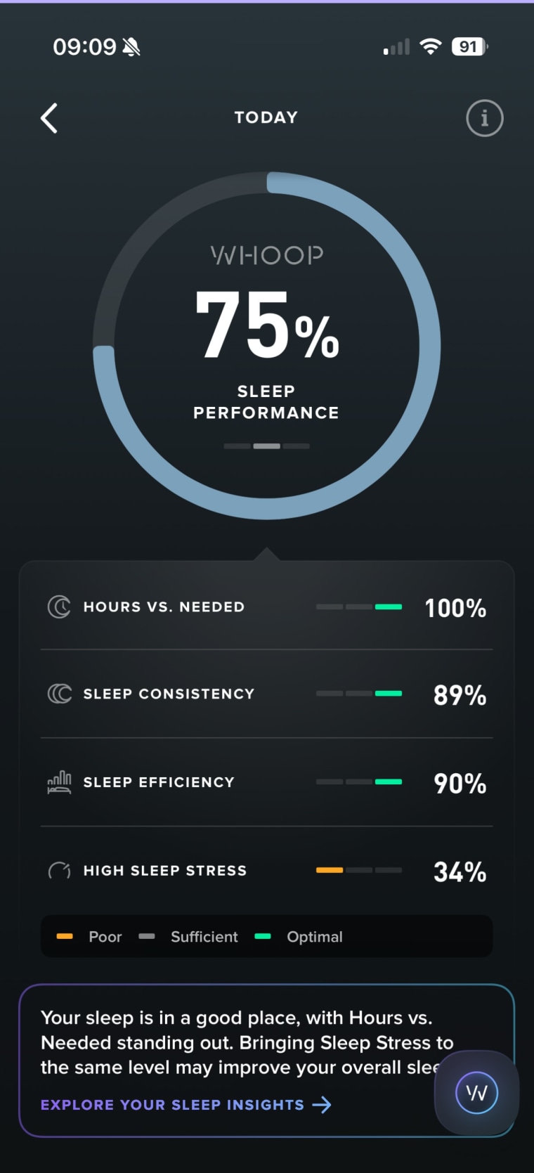 Like many other trackers, Whoop monitors your time spent asleep every night, showing you how much time you spent in REM, deep, light sleep or awake. It also gives you a recovery score every day based on how the hours of sleep you got compared to your sleep need, as well as how your sleep consistency, efficiency and high sleep stress levels compare to your 30-day average. I find that the app's estimates of my sleep time are pretty accurate.