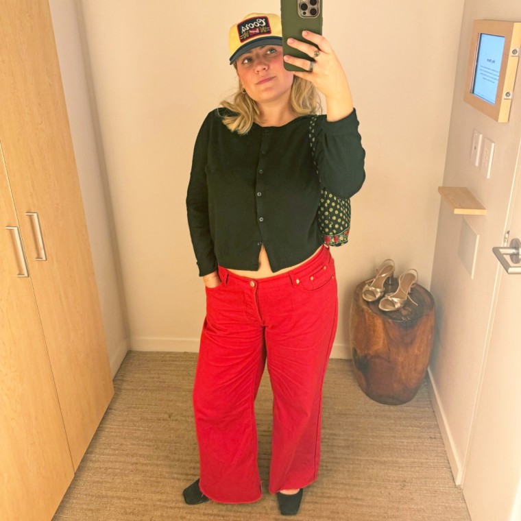To further test the fit, we also asked our deputy editor Alexandra Deabler to choose a pair. “I like the loose fit a lot, they’re comfortable that way. But they just need to be lower. They’re kind of like between low and mid rise,” says Deabler who is an advocate of the low-rise trend.