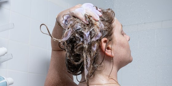 Korab suggests using So Silver by Matrix, which helps brighten platinum-blonde tresses. While washing with the bold, violet-hued formula, the brand recommends wearing gloves, as the tint can stain your hands. In addition to brightening capabilities, the shampoo has a soothing rosewood-and-jasmine scent with a touch of "leafy greens."