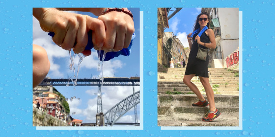 Lately, I've been bringing mine on my daily 6-mile walks around Porto, Portugal. Walking around this hilly city is such a physical challenge that there are actually outdoor escalators for residents in the steepest neighborhoods. I sweat a lot, but I swear this towel drops my body temperature by at least 2 to 3 degrees. After an hour or so, when the towel starts to lose some of its coolness and needs refreshing, I just duck into a restroom and get it wet again. Of course, since Porto is located where the Atlantic Ocean meets the Douro River, I can also just dunk it in a natural water source.