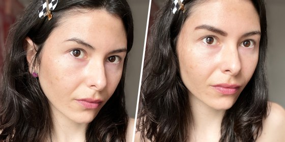 The product itself is a simple concept. It comes with two sets of stencils, a dual-ended brush and a brow stamp, which consists of a rounded sponge with powder pigment built into the cap. I felt bold, so I went with the thicker stencil, aptly named "Confident." From there, all you have to do is hold the stencil over your brow and lightly press the stamp along its length. Once you remove the stencil, you can use the included brush to fill any areas that need touch-ups. Then, flip to the spool-y end to brush away excess powder. The entire process took less than two minutes — and in that time, my brows were as close to perfect as they'll ever be.