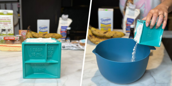 I put my Kitchen Cube to the test while making banana bread, which called for liquids like vanilla extract and milk, along with finer ingredients like flour, sugar, and baking soda. And since I was baking, all the measurements needed to be taken with care (except for my special ingredient — chunky chocolate chips — which are always measured by love, not science).