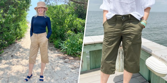I’d recommend these skimmers for their level of quality, fit, and comfort. Unlike frumpy skimmers with drawstring waists, cuffed hems, and button flapped back pockets, these are a stylish option when you’re looking for a little more coverage than with shorts. They come in 9 sizes (2, 4, 6, 8, 10, 12, 14, 16, 18) and 10 shades (olive, white, black, ecru tropical floral, gray, iris, blue, papaya, poppy, tan). I chose the tan and olive options because they’re two colors I’ll be able to wear into fall.