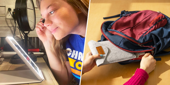 This makeup mirror weighs less than — and has almost the same dimensions as — my Kindle Paper White, making it easy to travel with. Plus, it comes with a protective sleeve, so I don't have to worry about the glass scratching or breaking. I recently brought it with me when I traveled from New York to my hometown of Cedar Rapids, Iowa, to see how it could withstand multiple flights in a bag that was likely being tossed around by many airport worker hands. After recovering it from baggage claim, I was relieved to find the mirror still intact.