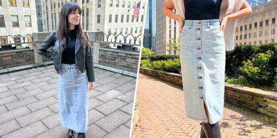 When shopping for the ideal long denim skirt, Cooper advises taking account of your body type, height and personal style first. However, she highlights two styles that tend to look great on almost everyone: a knee-length pencil skirt and a flowing mermaid maxi skirt.