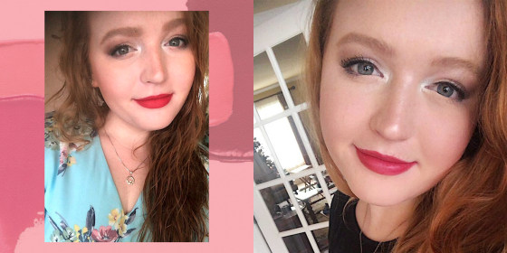 My go-to shade is a bright red called "Couture." I slap it on in the morning and it stays on all day — even through lunch.