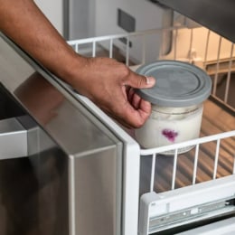 Once completely frozen, take the pint out of the freezer and check to ensure the ingredients have not frozen at an angle. Assemble the device by plugging it in, and installing the pint, creamerizer paddle, lid and outer bowl. Then, choose your desired setting. Once the program is done, remove the pint by pressing the release button and twisting the handle clockwise. If you find that the end result is crumbly or powdery, use the re-spin function. The brand says that this is often needed for very cold bases.