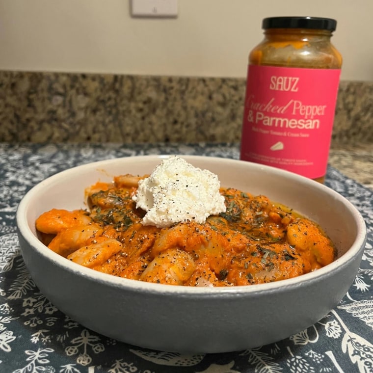 “That said, I couldn’t help but be intrigued by Sauz’s thoughtful (and sometimes out-of-the-box) flavors and eye-catching packaging, so I’ve taken myself out of my saucy comfort zone to try some of their offerings over the last several months,” says Bender. “Out of all the ones I’ve tried, the one that surprised me the most was their Cracked Pepper & Parmesan. Described to be as if “marinara and cacio e pepe had a baby,” it’s exactly as promised — while you’re getting the classic notes you’d expect from a typical marinara, but the peppery, creamy notes are pronounced and decadent without feeling too heavy.”
