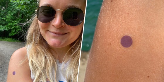 Each sticker is designed with three layers. The first layer is the waterproof adhesive, which keeps it on your skin. Next is the UV-sensing ink, which is purple in UV light, then turns clear in the sun after you apply sunscreen. As you're out in the sun, it'll turn back to its original shade to let you know when it's time to reapply. The final layer features the brand's Dermatrue technology, which is said to act "just like your skin," to sense things like differences in SPF and UV levels and respond like your skin does to give you an accurate idea of how protected you are, according to the brand.