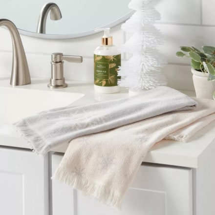 A snowflake so nice, you can have it twice! This set of two hand towels perfectly matches the soap dispenser, making bathroom decor a breeze. We're smitten with the tree-shaped dispenser and towel set too.