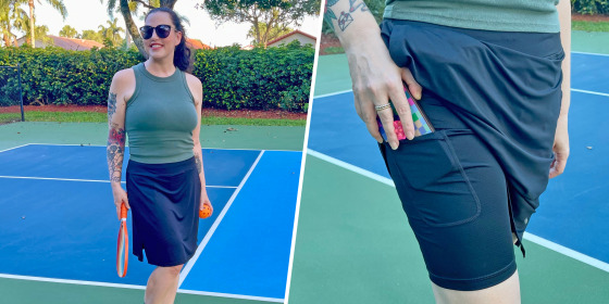 In addition to inherently covering more skin than shorter skirts, the material itself — a stretchy blend of polyester and spandex — has a UPF (ultraviolet protection factor) of 50+, offering my skin much-needed damage defense. Whether I’m playing pickleball after work, before sundown or taking a walk to get coffee on a weekend morning, it’s nice to know not too much sun is sneaking through.