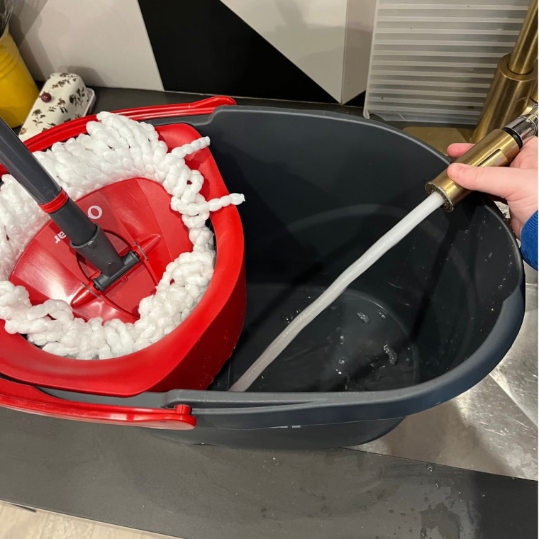 If you have a smaller sink like I do, you might have to fill up the water basin in the shower. I used pretty lukewarm water, and put in some Fabuloso to help get a deeper clean. I filled the tank up about halfway to the fill point. I like that the bucket comes with a large handle, but it can be annoying having to carry around a heavy bucket with no top if your home has multiple floors or hard spaces.